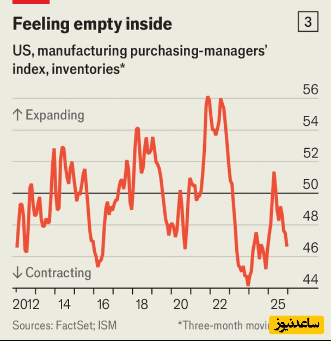 رفتارِ بنگاهها نیز نشان میدهد از این پس درآمدِ تعرفهای کمتر خواهد شد. با انتظار برای وضع برخی عوارض از سوی آقای ترامپ، بسیاری از شرکتها در اوایلِ سالِ 2025 (اوایلِ 1403 شمسی؛ یعنی دی/بهمن/اسفندِ 1403) بهشدت انبارها را پر کردند. این به آنها اجازه داد پس از اعمال تعرفهها برای مدتی واردات را کاهش دهند. اما آن استراتژی دیگر تمام شده است: نظرسنجیها نشان میدهد موجودیِ انبارهای شرکتها در حال کاهش است (نمودار 3). بنابراین برخی از واردکنندگان از تأمینکنندگان خارجی درخواست کردهاند قیمتهایشان را پایین بیاورند، که این خود ارزش مشمول مالیاتِ کالاهای وارداتی را کاهش میدهد.