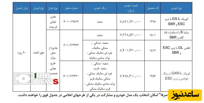به گزارش سرویس سیاست پایگاه خبری ساعدنیوز، به گزارش تحریریه صنعت خبرگزاری صدا و سیما؛ در این طرح فروش خودروهای کوییک GX-L، ساینا S، اطلس GL و کوییک GXR-L برای متقاضیان عادی، طرح حمایت از خانواده و جوانی جمعیت و دارندگان خودروهای فرسوده عرضه شده است.