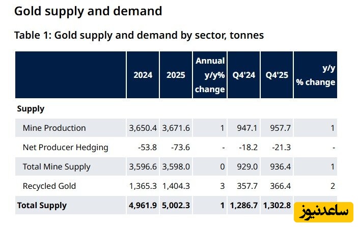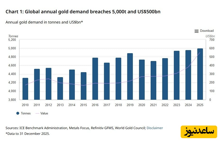 طلا در سال 2025 رکوردهای زیادی را ثبت کرد. تقاضای جهانی برای طلا به بیش از 5000 تن رسید که برای اولین بار در تاریخ رخ داد. قیمت طلا نیز در این سال 53 رکورد جدید قیمت تاریخ را ثبت کرد و ارزش کل تقاضای طلا به 555 میلیارد دلار رسید که نسبت به سال گذشته 45 درصد افزایش داشت.