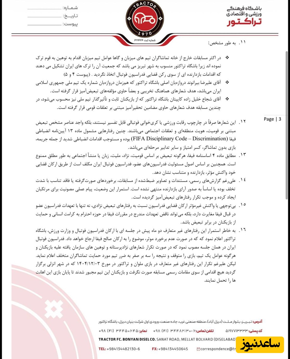 تراکتور همچنین در بخش پایانی تصریح کرده هدف از این اقدام، تضعیف فوتبال ایران نیست بلکه صیانت از عدالت رقابتی، مقابله با تبعیض و تضمین اجرای یکنواخت مقررات در چارچوب نظام بینالمللی فوتبال است؛ موضوعی که به گفته مدیران این باشگاه، فراتر از یک پرونده انضباطی داخلی ارزیابی میشود.