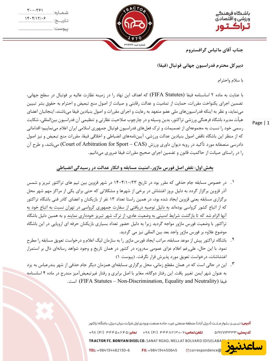 این نامه با امضای هیأت مدیره باشگاه تراکتور و خطاب به ماتیاس گرافستروم، دبیرکل فدراسیون جهانی فوتبال (فیفا) ارسال شده و در آن با استناد به مواد اساسنامه و آییننامههای انضباطی فیفا، تصمیمات و برخی ترکفعلهای فدراسیون فوتبال ایران مورد اعتراض قرار گرفته است.