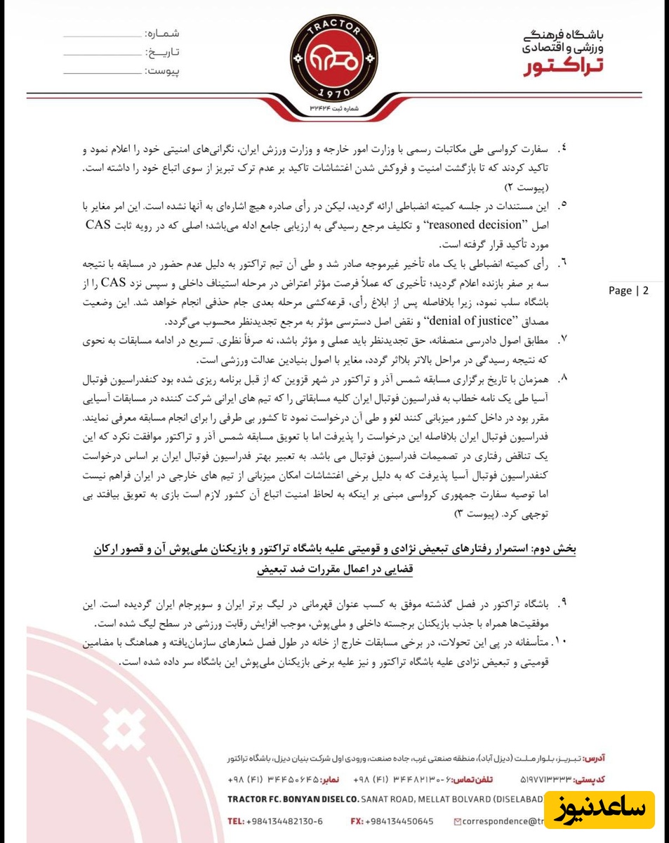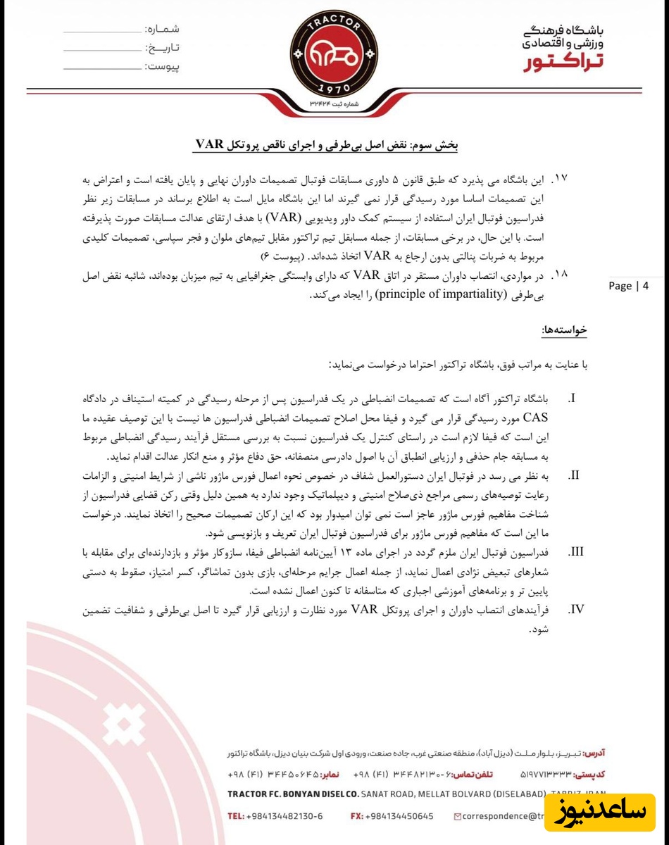 باشگاه تراکتور هدف از این شکایت را نه تضعیف همبستگی ملی بلکه صیانت از فوتبال ایران دانسته است. بخشهای مهم نامه در ادامه آورده شده است: