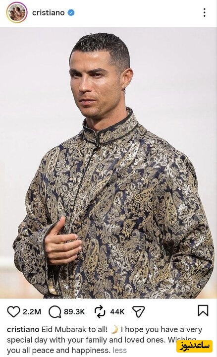 به گزارش سرویس ورزش ساعدنیوز، کریستیانو رونالدو بازیکن مشهور پرتغالی فوتبال با انتشار پیامی در صفحه شخصی خود نوشت: «عید همگی مبارک! امیدوارم روز خیلی خوبی را در کنار خانواده و عزیزانتان داشته باشید. برای همه شما آرامش و شادی آرزو میکنم.»