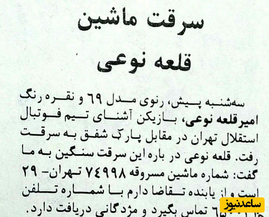 به گزارش سرویس ورزش ساعدنیوز، اوایل سال 1370 بود که امیر قلعه نویی بازیکن آن روزهای استقلال و تیم ملی یکی از اتفاقات بد زندگی شخصی خود را تجربه کرد. اردیبهشت آن سال، خودروی قلعه نویی مورد سرقت قرار گرفت و بازیکن جوان آبیها به عنوان مالباخته ضمن انتشار آگهی گم شدن خودرو، برای پیدا شدن آن مژدگانی در نظر گرفت.