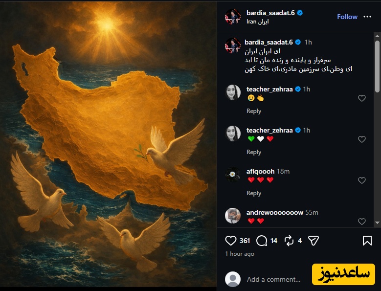 به گزارش سرویس ورزش ساعدنیوز، واکنش بردیا سعادت به تهدیدات دونالد ترامپ علیه ایران، رنگوبویی کاملاً احساسی و وطندوستانه داشت؛ جایی که او با جمله تأثیرگذار «ای وطن، ای سرزمین مادری...» احساس تعلق عمیق خود را به ایران به نمایش گذاشت. این پیام، بیش از آنکه یک موضعگیری سیاسی باشد، بازتابی از عشق به خاک و هویتی بود که در وجود او ریشه دوانده است.