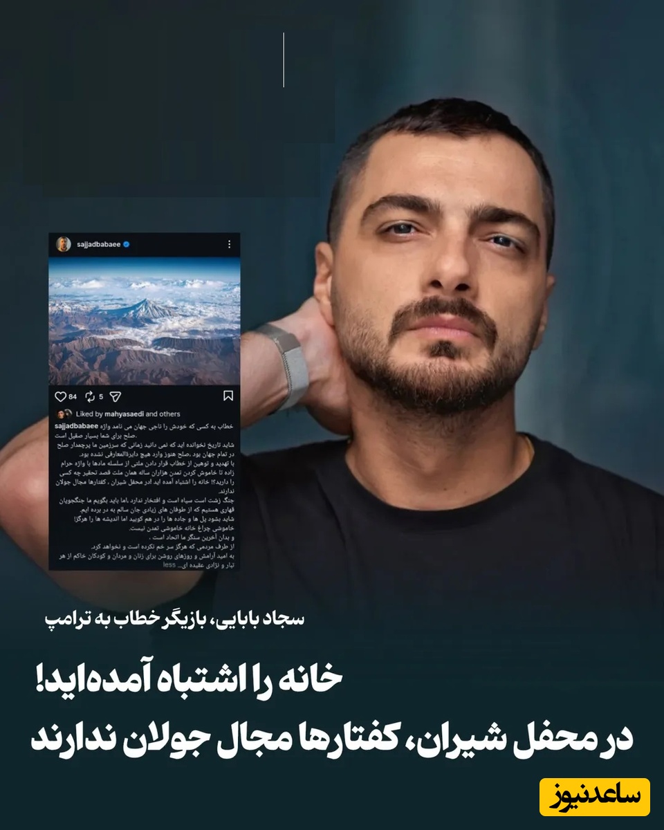 به گزارش سرویس هنر و رسانه پایگاه خبری تحلیلی ساعدنیوز، .سجاد بابایی، بازیگر در واکنش به یاوه گوییهای اخیر ترامپ نوشت: خطاب به کسی که خودش را ناجی جهان مینامد واژه صلح برای شما بسیار ثقیل است. شاید تاریخ نخواندهاید که نمیدانید زمانی که سرزمین ما پرچمدار صلح در تمام جهان بود، صلح هنوز وارد هیچ دایرهالمعارفی نشده بود. ا تهدید و توهین از خطاب قرار دادن ملتی از سلسله مادها با واژه حرامزاده تا خاموش کردن تمدن هزاران ساله همان ملت قصد تحقیر چه کسی را دارید؟! خانه را اشتباه آمدهاید! در محفل شیران، کفتارها مجال جولان ندارند.